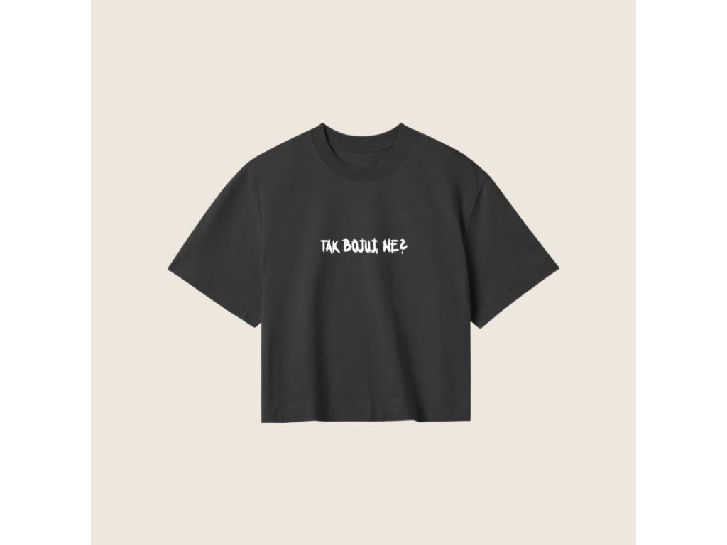 Strih: voľný skrátený strih, vyšší guľatý výstrih, presahujúce ramená